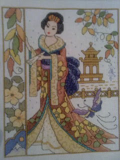 Yesterday evening I also got finally finished one of my longtime WIPs the other of two Geishas. As I'm not at home right now won't state the designer or where I got the design from. I'll add that info later. If I remember correct it is from Cross Stitch Gold and its either Joan Elliott or Lesley Teare design. I don't know why I hate so muck backstitches and they usually make my WIPs to UFOs....